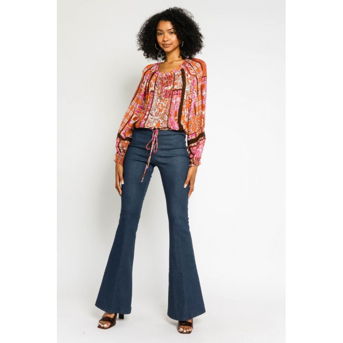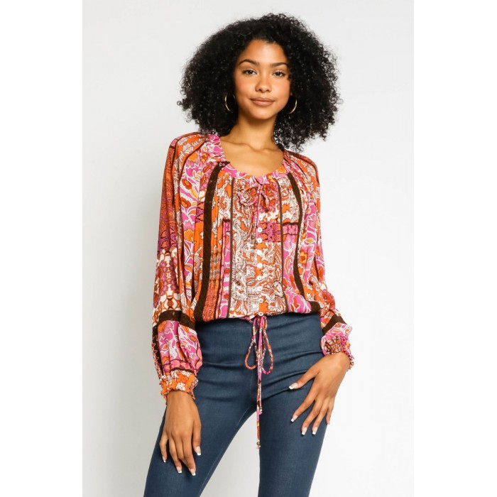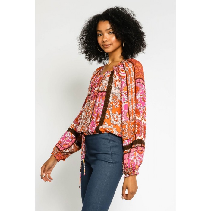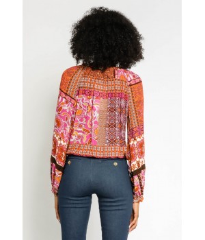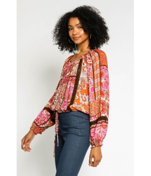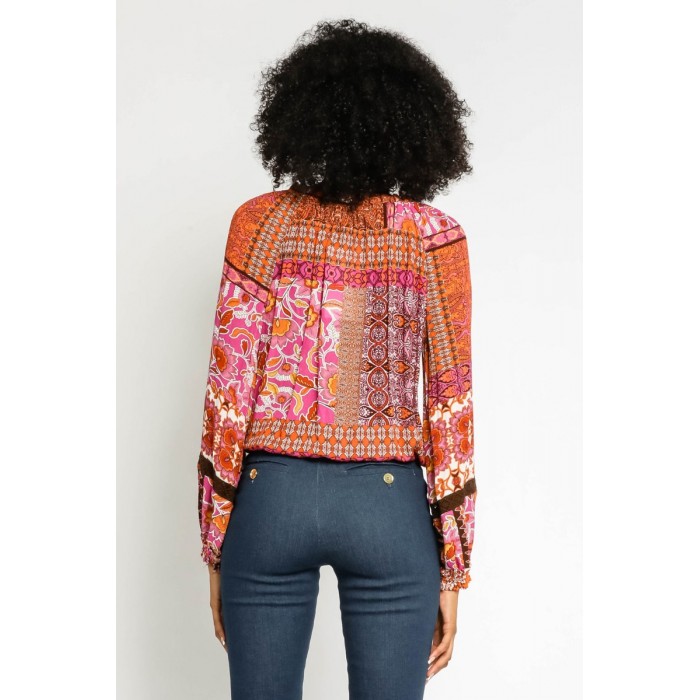 Magenta Patchwork Blouse features a drawstring waist and button up front. Can be worn on or off the shoulders. Lace detailing down the front panel and above the elastic cuffs.