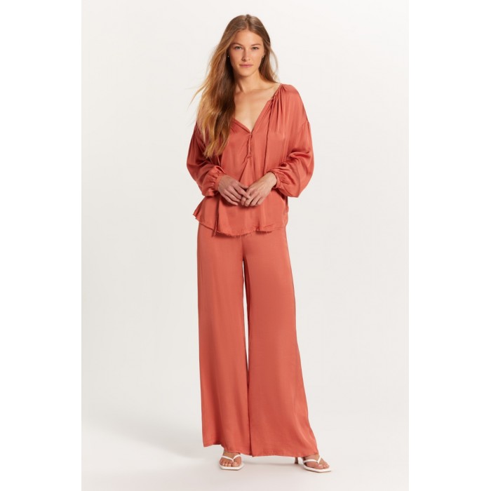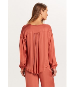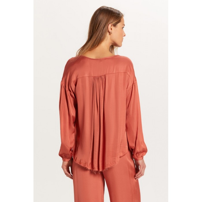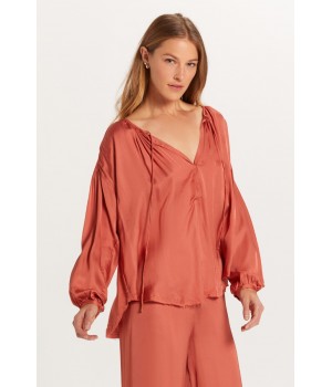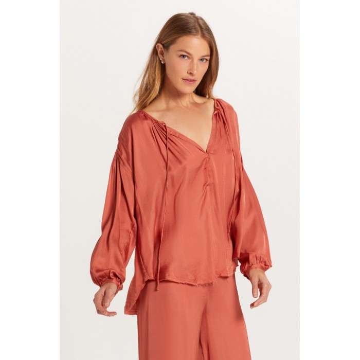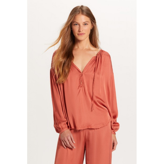 Terracotta Satin Peasant Blouse features drawstrings and a frayed hem.