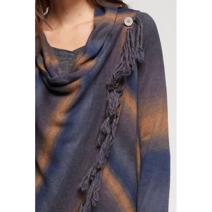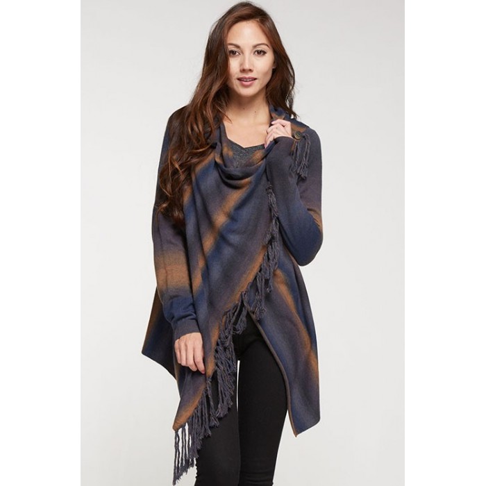 Ombre dye, draped asymmetrical cardigan sweater with fringe accent hem and side button. Can be worn like a poncho with a cowl-neckline or as an open front asymmetrical cardigan.