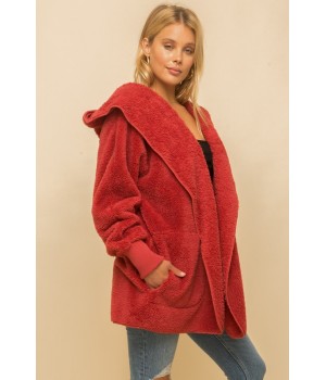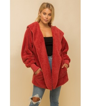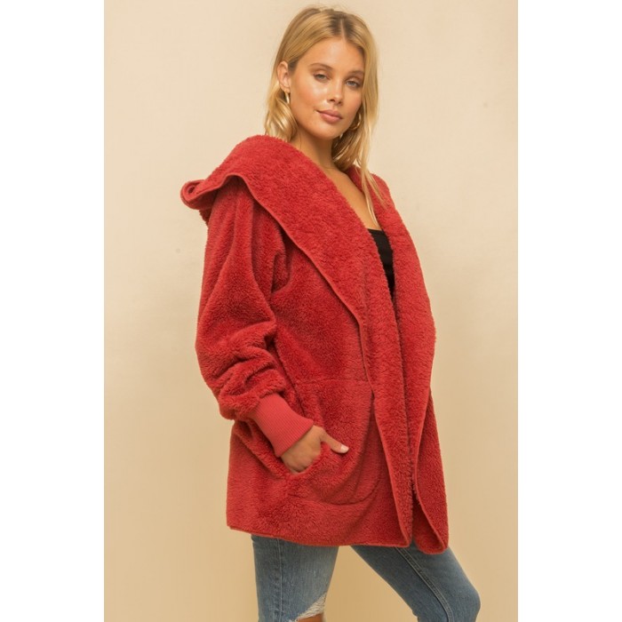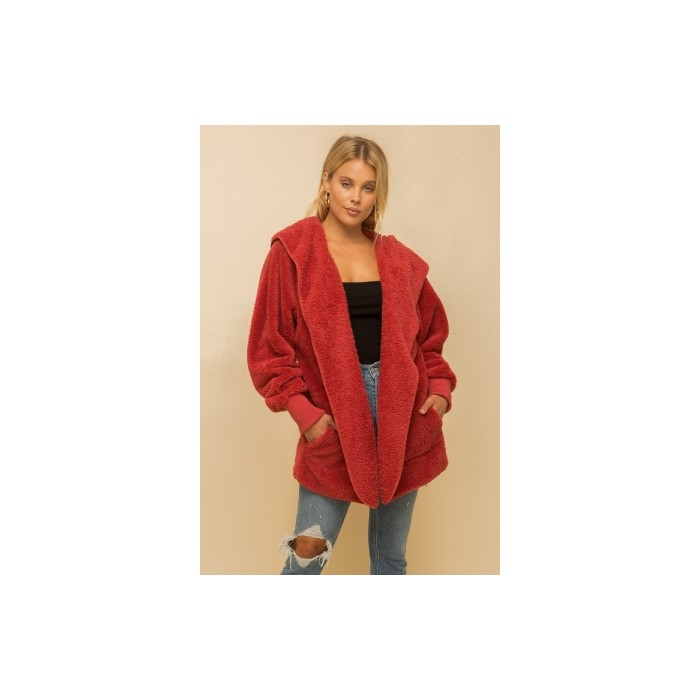 Faux fur, plush hooded jacket with an open front and pockets. VERY VERY SOFT like a baby blanket, great for everyday just wrap it and get cozy!