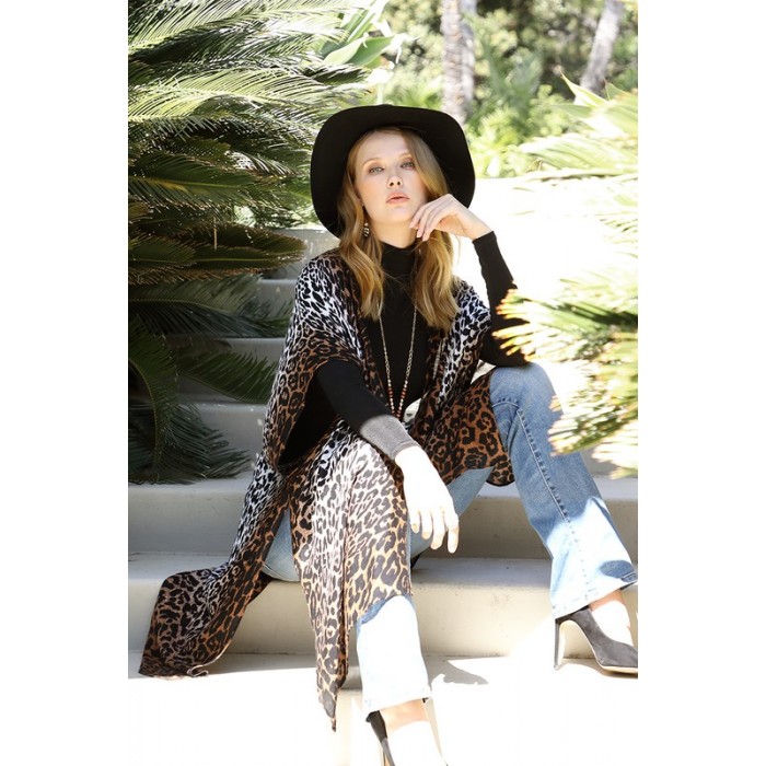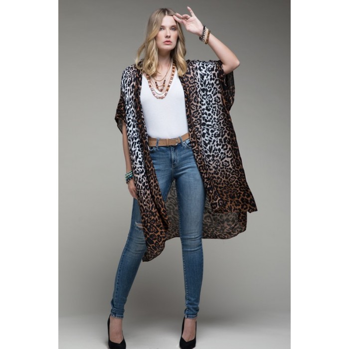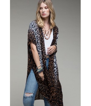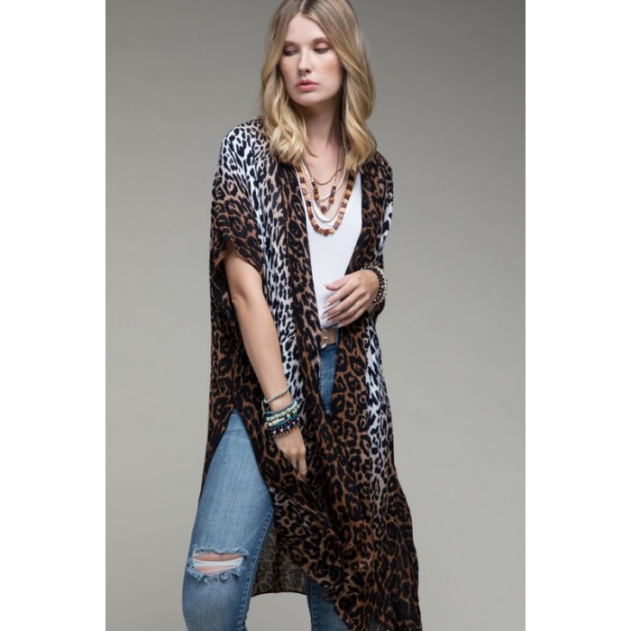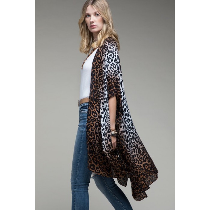 Gradual white to pink ombre leopard allover print kimono with side slits