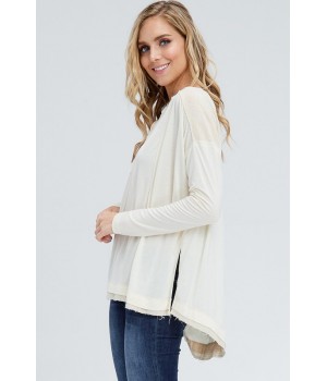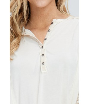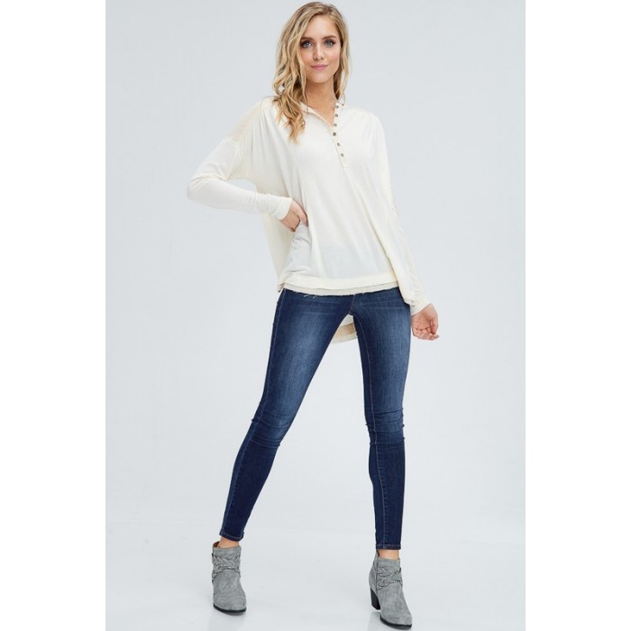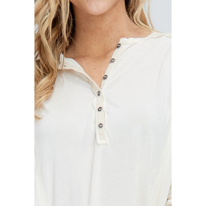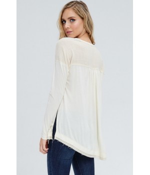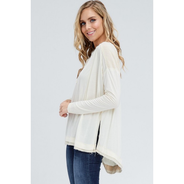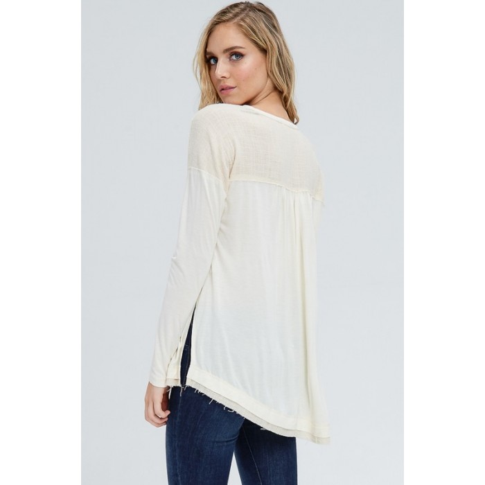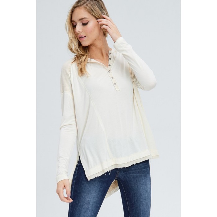 Henley knit top with raw edges. The body is modal and the contrast detailing at shoulders, placket and bottom trim is cotton with a linen finish. This 6 button henley has a loose casual look that can be worn alone or used to layer with a vest or sweater.